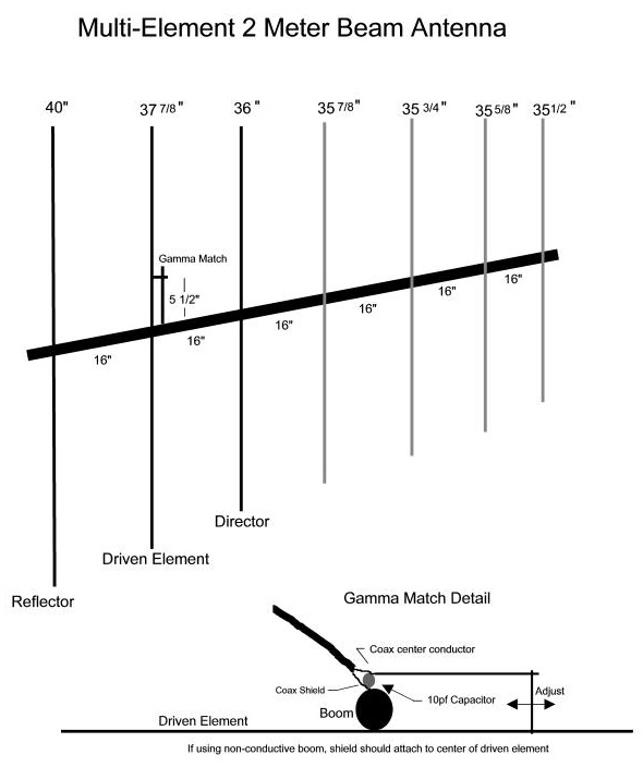 The gamma match bar spacing from the element is not critical but if it is over an inch or so, some shortening of the gamma attachment point may be needed. The gamma attachment point and the gamma capacitor may be varied to obtain a good VSWR. The antenna will usually work quite well with the dimensions given and a 10 to 12 pf gamma capacitor. Seal the end of the coax and the gamma capacitor well to prevent moisture from entering.